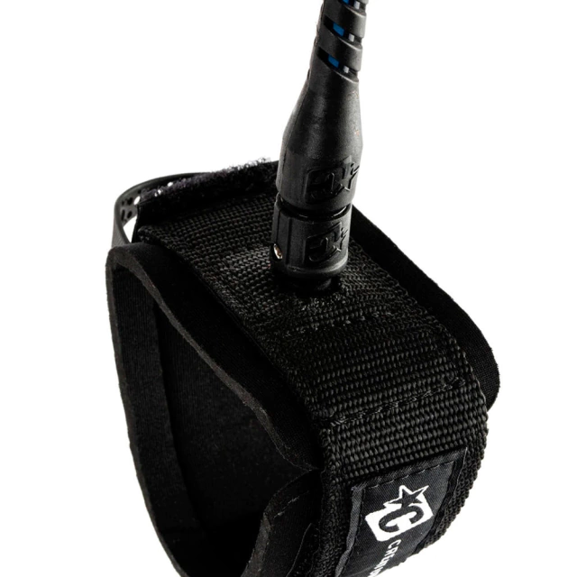 Sistema pioneiro de saque rápido, a tornozeleira possui uma alça de fácil acesso para abrir o leash em casos de emergência.
